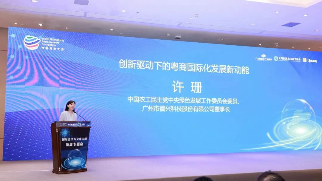 中国农工民主党中央发展工作委员会委员、广州市儒兴科技股份有限公司董事长许珊围绕“创新驱动下的粤商国际化发展新动能”,强调了创新在粤商国际化进程中的核心地位,鼓励企业加大研发投入,提升自主创新能力,以创新引领国际化发展。