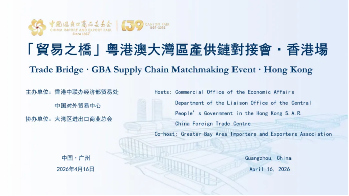 On the afternoon of April 16, a key supporting event of the 139th China Import and Export Fair (Canton Fair) — “Trade Bridge · Guangdong-Hong Kong-Macao Greater Bay Area Supply Chain Matchmaking Event · Hong Kong Session” was successfully held in Guangzhou. Under the theme of “Friends from Afar · Smart Manufacturing for Win-Win Cooperation”, the event was co-hosted by the Trade Office of the Economic Affairs Department of the Liaison Office of the Central People’s Government in the Hong Kong SAR and the China Foreign Trade Centre, and co-organized by the Greater Bay Area Importers and Exporters Association.25 Hong Kong buyers and more than 70 Canton Fair exhibitors gathered for precise and efficient supply chain matchmaking, promoting the in-depth integration of “GBA Smart Manufacturing + Hong Kong Services” and injecting strong impetus into the coordinated economic and trade development of the Guangdong-Hong Kong-Macao Greater Bay Area.
